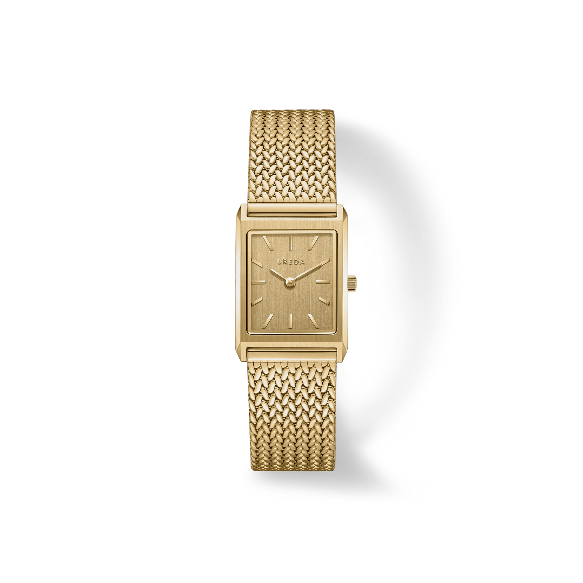 The Tethered Collection exists as a daily reminder of our human connection and our shared memories intertwined, endlessly collapsing together. The Virgil (Tethered) Small features a more compact 20mm rectangle case and is complemented by a gold brushed dial with a woven mesh bracelet that fastens with a quick release clasp.