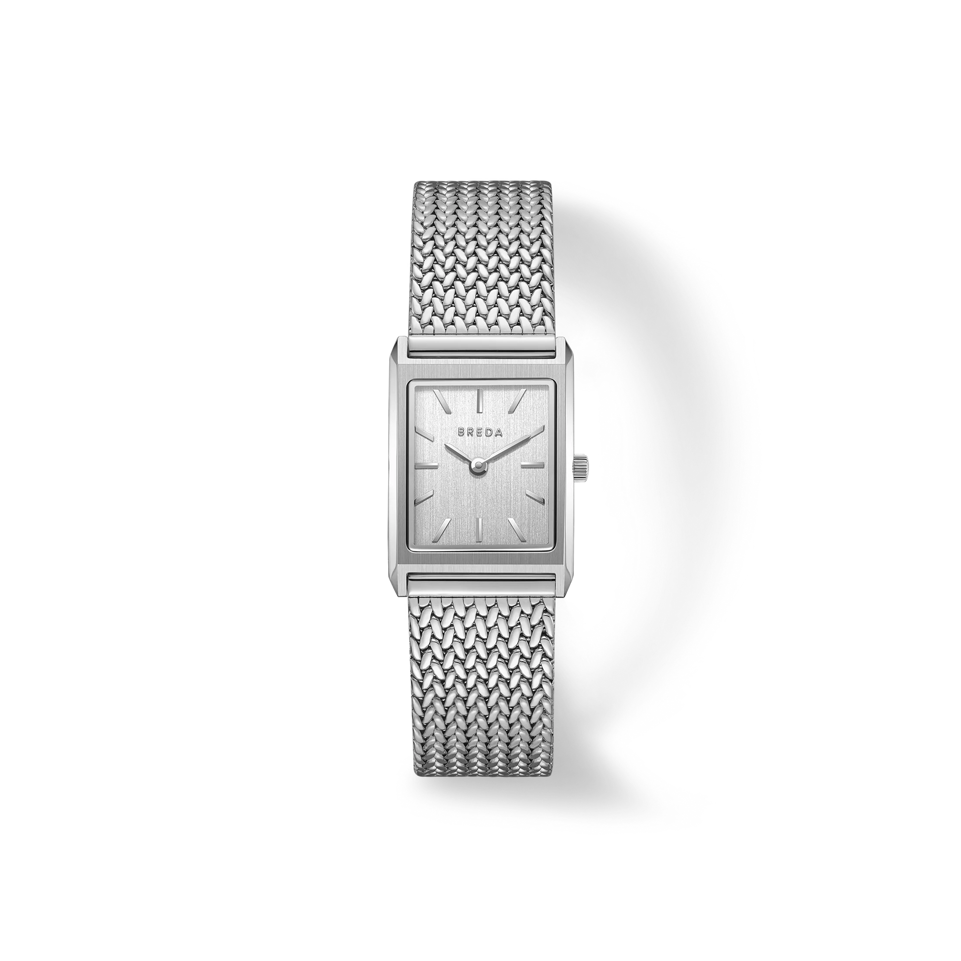 The Tethered Collection exists as a daily reminder of our human connection and our shared memories intertwined, endlessly collapsing together. The Virgil (Tethered) Small features a more compact 20mm rectangle case and is complemented by a silver brushed dial with a woven mesh bracelet that fastens with a quick release clasp.