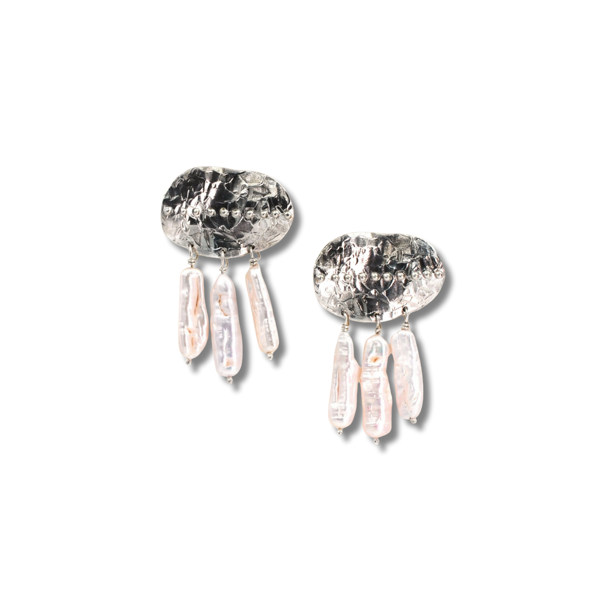 The Artemis Earrings showcase large textured link studs elegantly accented with three white cultured stick pearls each. This design combines bold metalwork with the timeless beauty of pearls, offering a sophisticated accessory that enhances both formal and casual ensembles. Crafted for those who appreciate refined detail and expert craftsmanship.