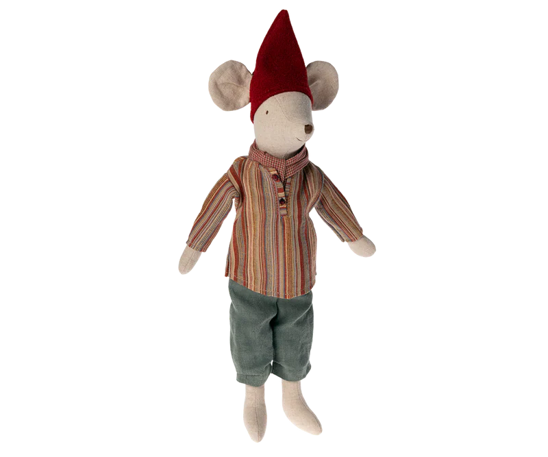 A classic mouse in size medium dressed in cozy Christmas clothes. Use them for play or as a part of your home decoration during December. His hat is removeable so when the season is over you can change her clothes and she is ready for more play.