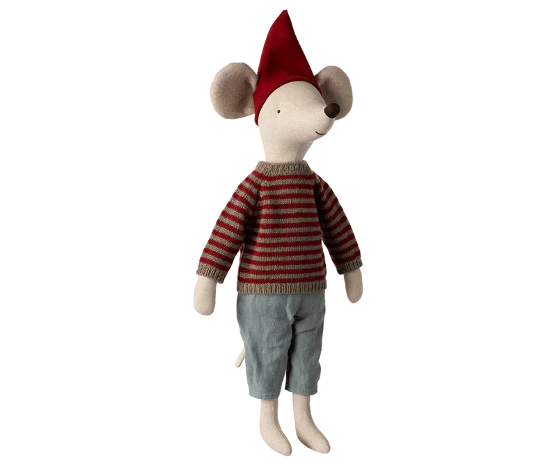 This mouse in size maxi wears his christmas hat and warm sweater - the ears are made in extra thick fabric to keep them warm.