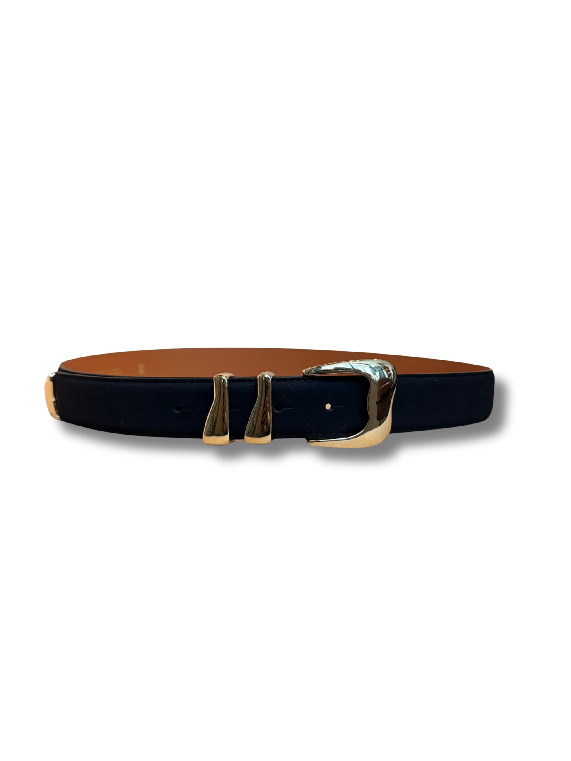 30mm nubuck leather belt – metal buckle, loops, and tip with a gold finish.