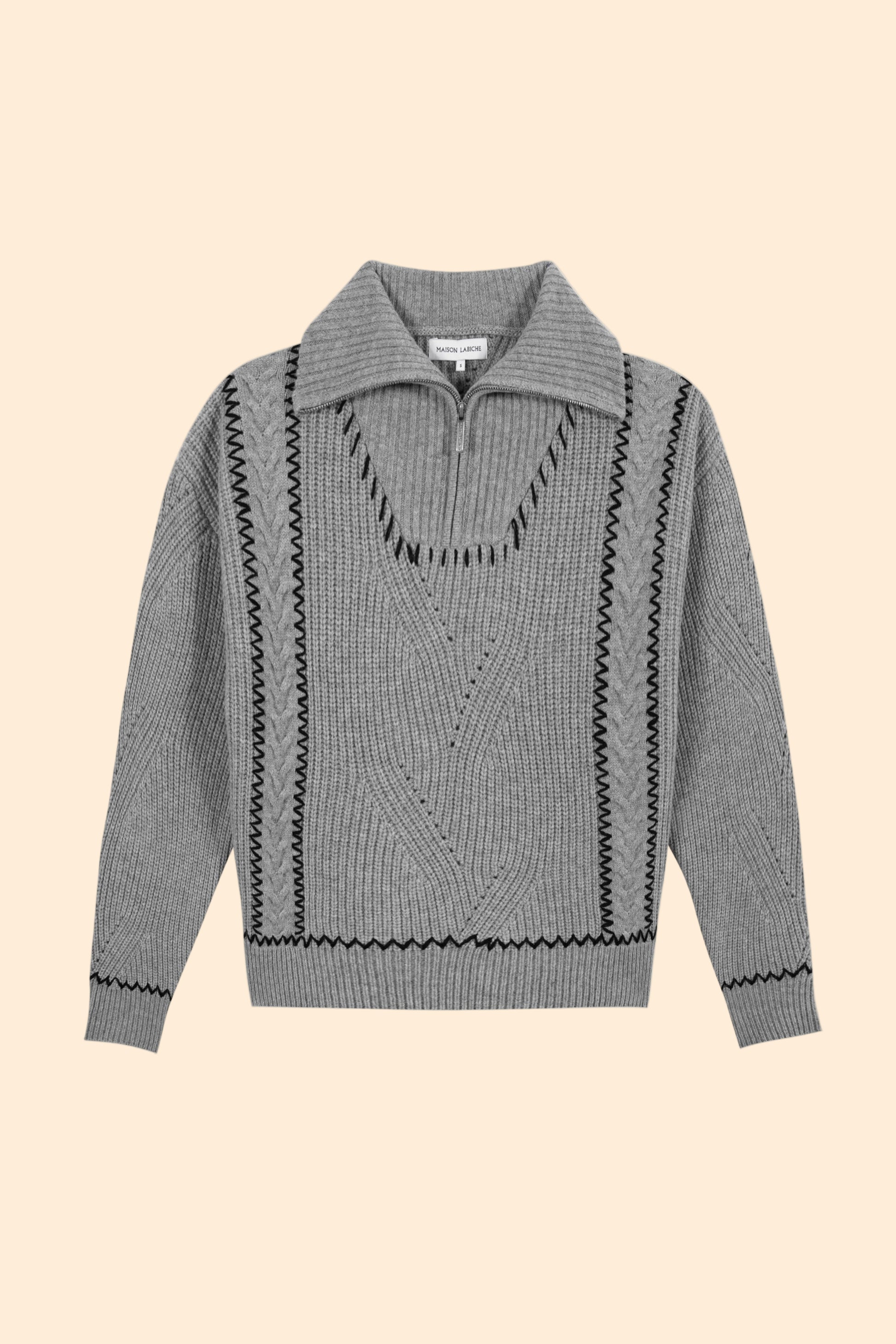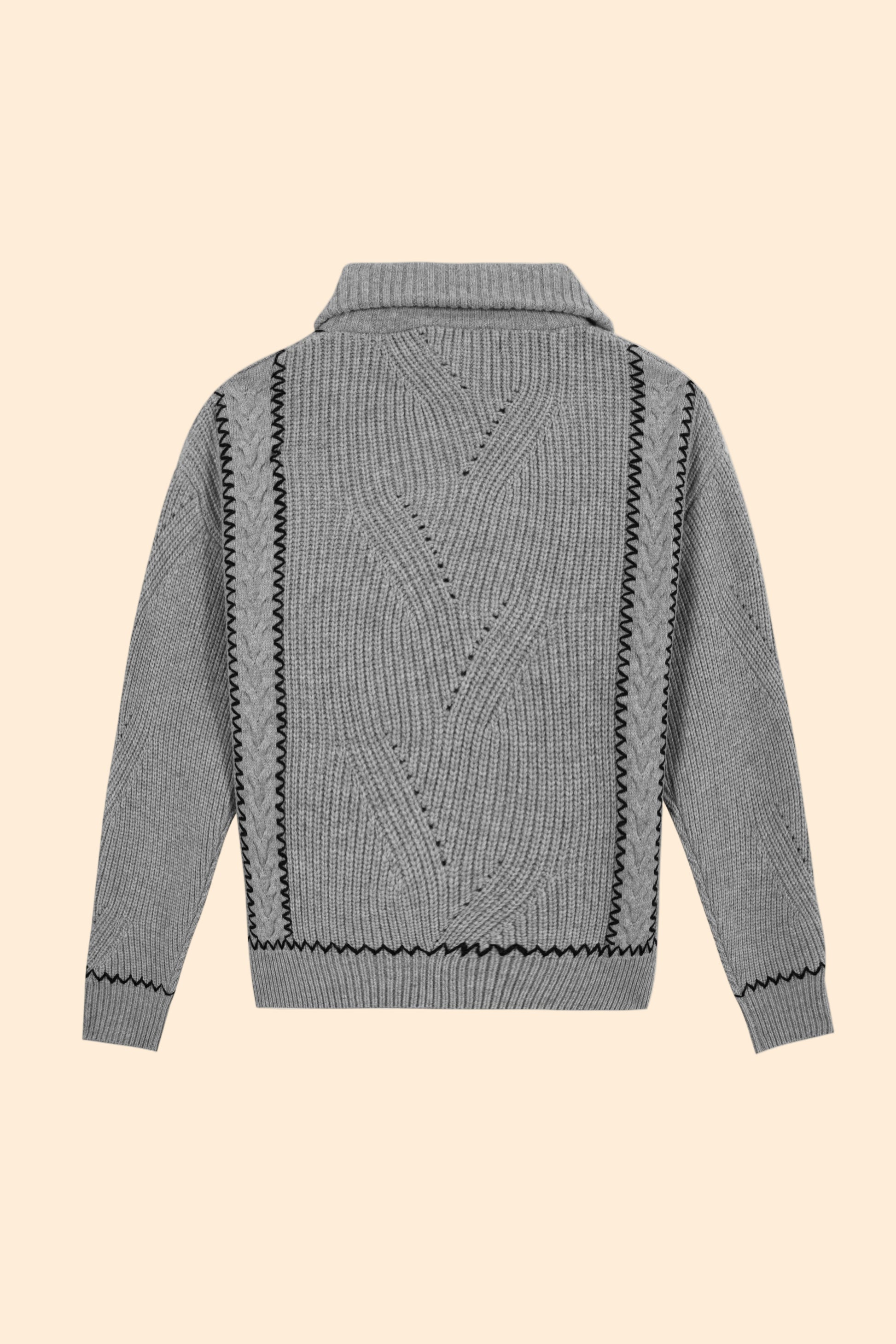 Our Champaubert trucker sweater has a comfortable cut and a high zipped collar in ribbing. It has twists on the body and sleeves. It is finished on the bottom sleeves and bottom body with ribbing.