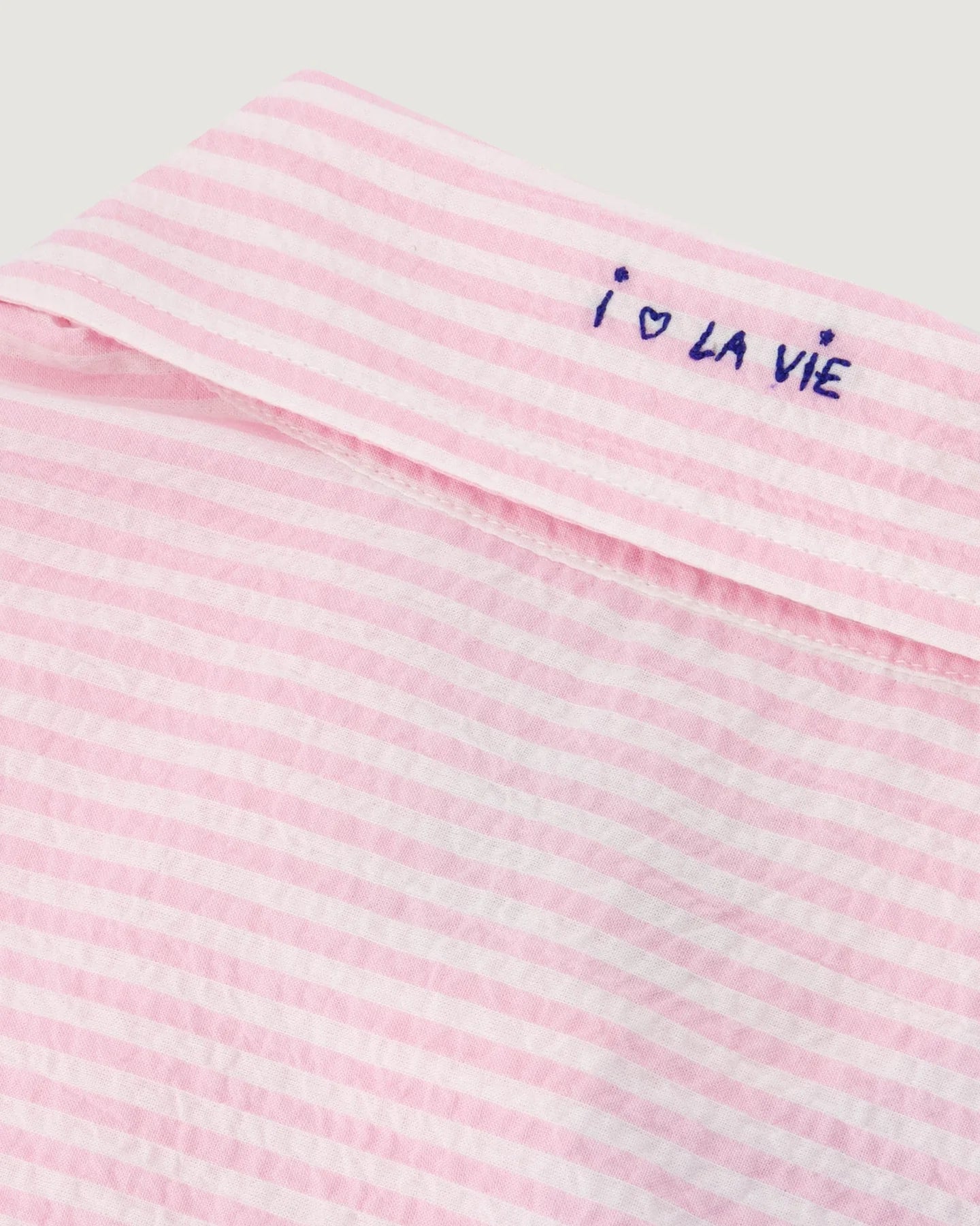 Our iconic Loutil shirt has a large and straight cut with a box pleat in the middle of the back, a round bottom, a chest pocket and Maison Labiche embroidery on the collar and engraved buttons. Its embroidery is a statement.