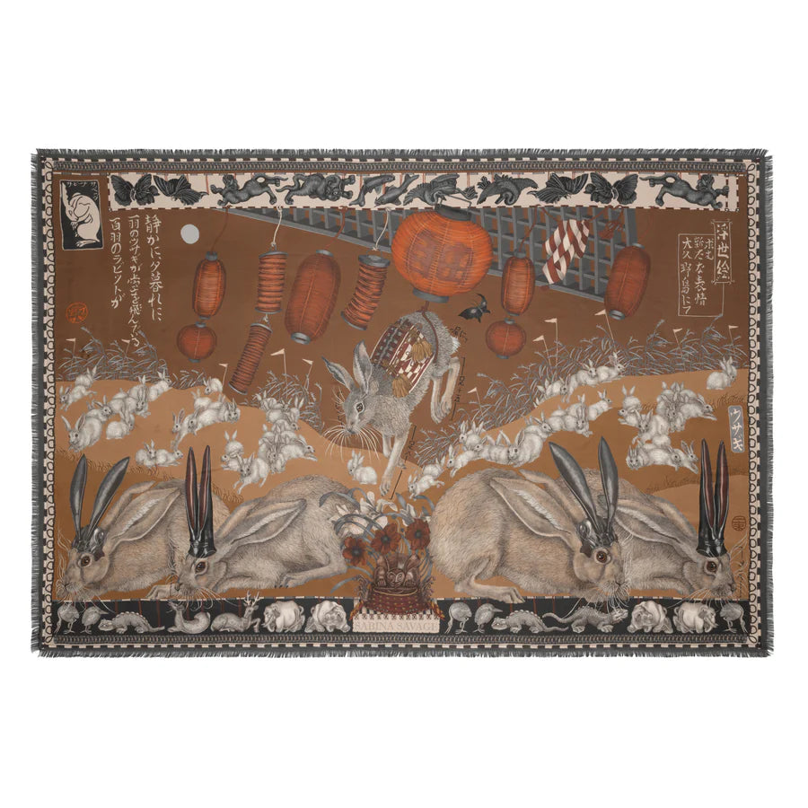 This design references many elements of the arts and culture of Edo-period Japan. It features a pair of black tailed jackrabbits in the foreground corners, with a third floating behind while strung up to a paper lantern. The foremost jackrabbits are wearing miniature kawari kabuto (strange helmets), featuring stylised metal and lacquer rabbit ears, and between them rests a similar helmet in the form of a crouching rabbit. These helmets are based on true artefacts from Edo-period Japan. The central floating jackrabbit is sporting a woven, tasselled cloth bearing a famous samurai crest, while the lantern above is daubed with the word ‘rabbit’. A variety of traditional paper lanterns are strung from the top border, and a square trellis-style partition is visible behind, a nod to a detail in many antique woodblock prints. Behind the protagonists is a layered, grassy hillside teeming with white rabbits and silver reeds, and a round, glowing moon in the sky. The upper and lower borders feature lacquered and ivory animal-shaped menuki, tiny carved sword grips created in almost-matching pairs. Above and below the menuki sits a woven style border based around the handle grip of a samurai sword. The outer edges are lined with a striped flagpole tied at the corners and looped samurai rope. Throughout the design, details and measurements are noted in Japanese hand-script, echoing ancient zoological manuscripts from the 17th century. A haiku is scrawled down the left-hand side of the illustration, and a stamp/seal bearing a silhouetted rabbit and the name Sabina Savage brands the top left corner.