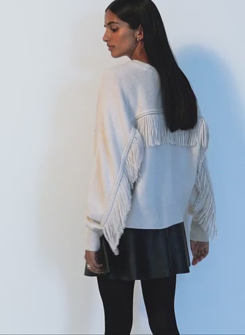 A crewneck defined by movement and texture. Spun from a plush wool–cashmere blend, this luxury sweater features hand-applied fringe, finely cut along the arms and back. Size up for an oversized look.