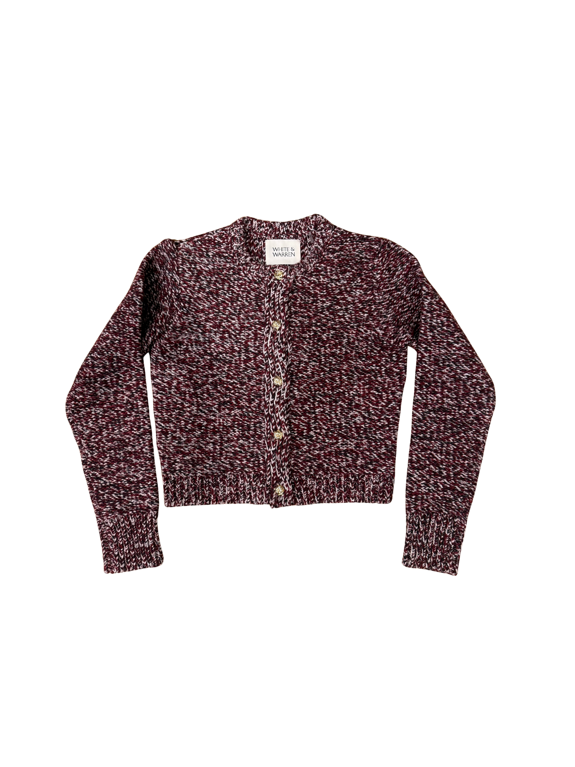 This cropped sweater blends cozy texture with refined detail. Knit from a marled yarn in rich tones of burgundy, cream, and charcoal, it features a crew neckline, long sleeves, and a subtle button-front closure. The soft, chunky knit offers warmth with a modern, boxy silhouette that pairs effortlessly with high-rise denim or tailored trousers.